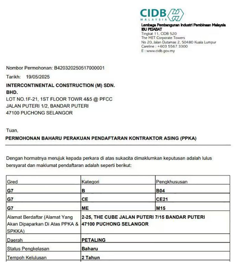 近日,經(jīng)馬來西亞建筑工業(yè)發(fā)展局(CIDB)批準(zhǔn),合景建設(shè)集團(tuán)有限公司全資子公司洲際建設(shè)(馬來西亞)有限公司取得馬來西亞最高等級G7承包商資質(zhì),包括土木工程(CE21)、土建工程(B04)、機(jī)電工程(M15)以及各種機(jī)械工程等多項內(nèi)容。這是合景建設(shè)在馬來西亞建筑資質(zhì)領(lǐng)域的重大突破,意味著公司在智慧建筑領(lǐng)域的技術(shù)實(shí)力、屬地化服務(wù)能力及行業(yè)影響力獲官方權(quán)威認(rèn)可。